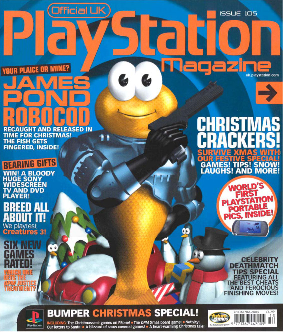 We've been surprised and delighted to see that our very own James Pond takes centre stage on the cover of this month's Official PlayStation Magazine (in the UK, at any rate). The first version of James Pond: RoboCod graced several front covers back in the winter of 1992, when the game first came out on Commodore Amiga, Atari ST and Sega Genesis (Megadrive) - that's 11 whole years ago. Although this game includes some significant enhancements for the PSOne (as does the GBA version which will also be released imminently) and features an entirely new set of level maps, I'm wondering if that might be some kind of record for a time gap between the first and latest versions of what is, in effect, the same game!
