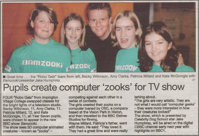 It's all ZOOKs these days. Just one day after I snuck into the BBC's Elstree studio to get an early peek at the BAMZOOKi TV gameshow being filmed, look what popped into our mailbox: a newspaper article from the local Cambridge Town Crier that shows one of the teams entered in the contest, the RoboGals from nearby Impington College! The set looked great and the contests and ZOOKs were brilliant. We can hardly wait for the programme to air!