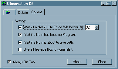 Data: This Applet shows details of all of your Norns in one easy to see list. Options allow you to set alarms for when Norns become ill, or pregnant.